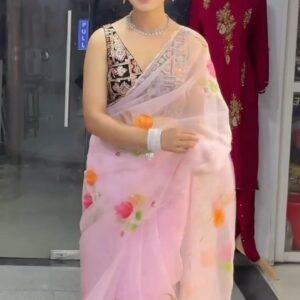 Baby Pink Floral Embroidered Net Saree with Designer Blouse