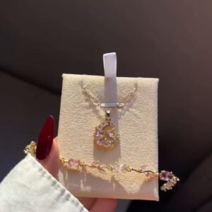 Crescent Pendant Necklace with Pink Crystal Bracelet Set
