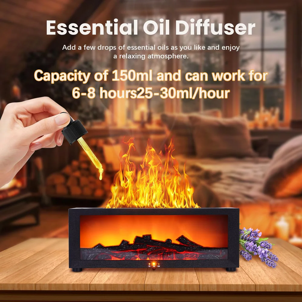 A stylish flame-effect diffuser with 7 color-changing LED lights and dual lighting modes, designed to create a warm, relaxing fireplace atmosphere without smoke or heat.