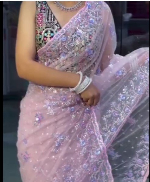 Baby Pink Floral Embroidered Net Saree with Designer Blouse