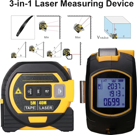 Dual measuring tool combining a traditional 5 meter measuring tape with a 60 meter laser distance meter for quick and accurate measurements. Equipped with a digital display for clear readings and multiple measurement modes. Ideal for construction, interior design, carpentry, and home improvement projects.