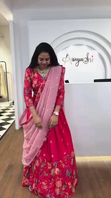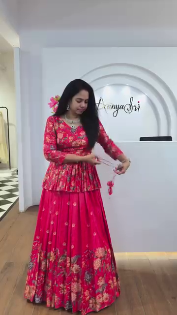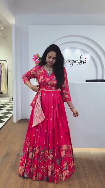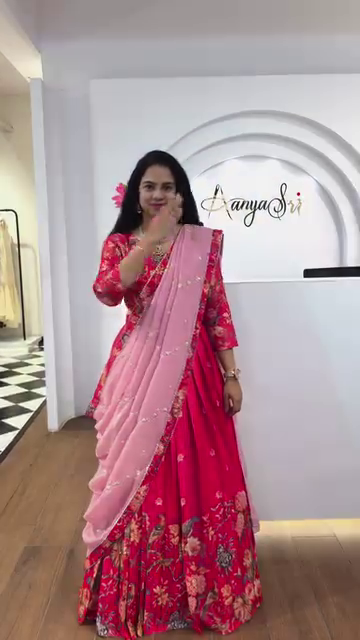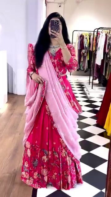 Step into elegance with this stunning pink floral lehenga set, designed for the modern woman who embraces traditional charm. This three-piece ensemble includes a vibrant floral-printed lehenga, a matching blouse (choli), and a soft baby pink dupatta adorned with delicate embellishments. Perfect for festive occasions and weddings, this outfit combines comfort with contemporary ethnic fashion.