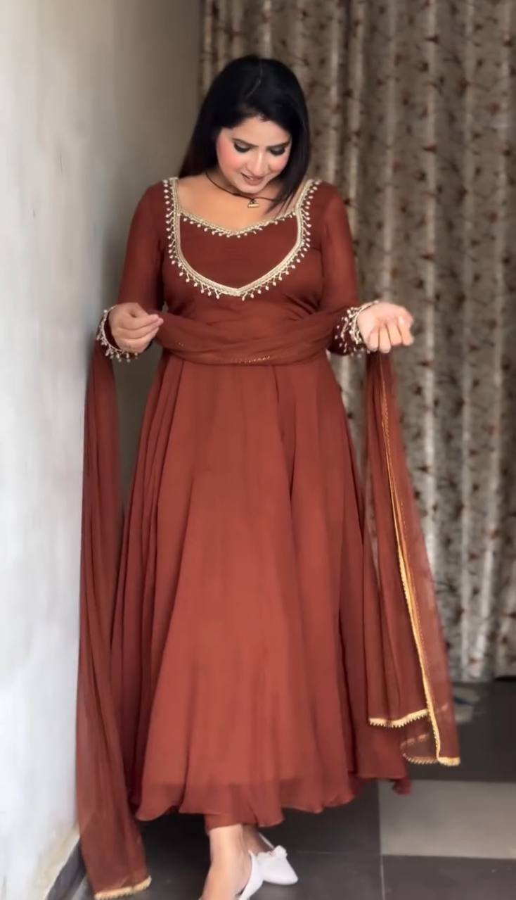 A graceful rust-colored Anarkali featuring delicate neckline embellishments, sheer sleeves, and a matching dupatta—perfect for festive gatherings and special occasions.