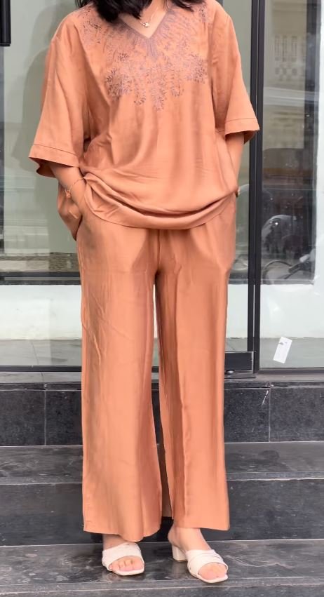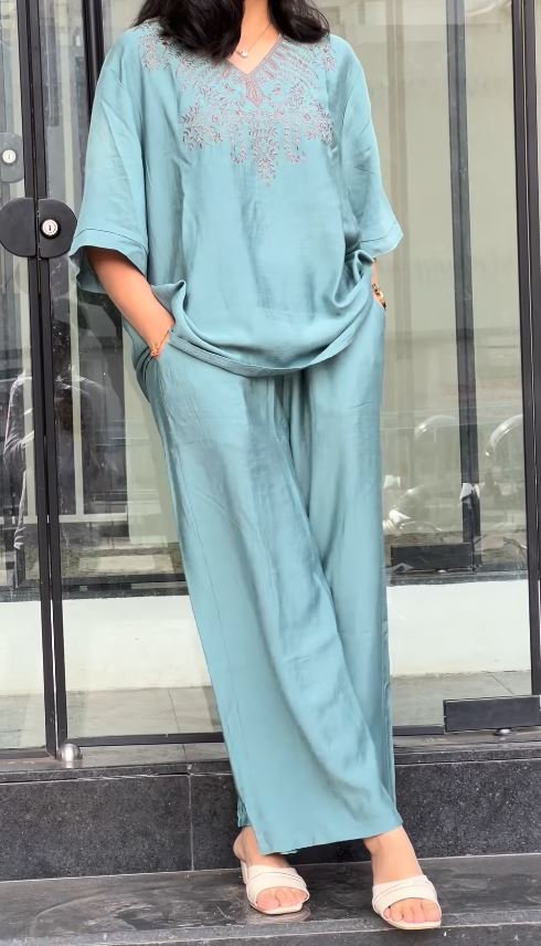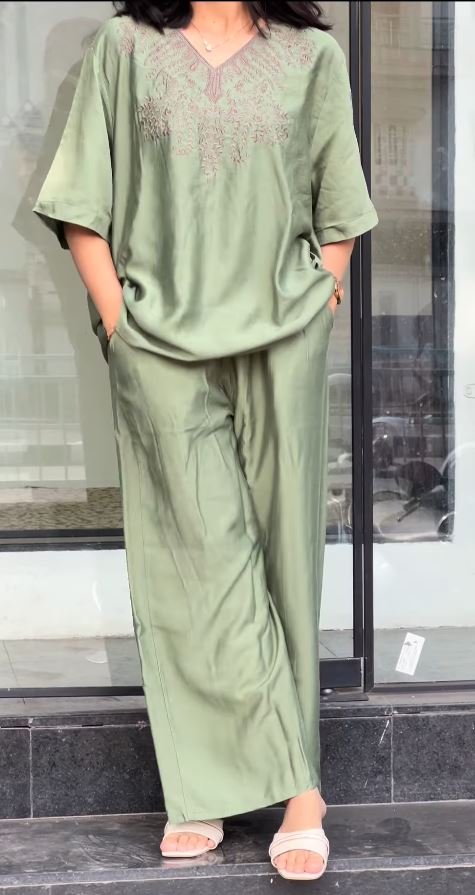 Experience the perfect harmony of comfort and understated luxury with this sage green co-ord set. The ensemble features an oversized tunic adorned with delicate, tone-on-tone embroidery that highlights the V-neckline, offering a touch of artisanal detail to a minimalist silhouette. Paired with fluid, wide-leg trousers, this set provides an effortless, airy drape that flatters all body types. Crafted from a high-quality fabric that moves with you, this versatile outfit is a timeless addition to any modern wardrobe, ensuring you stay polished and comfortable from morning to evening.