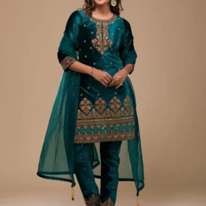 Peacock Blue Zariwork Velvet Readymade Salwar Suit – Regal Elegance