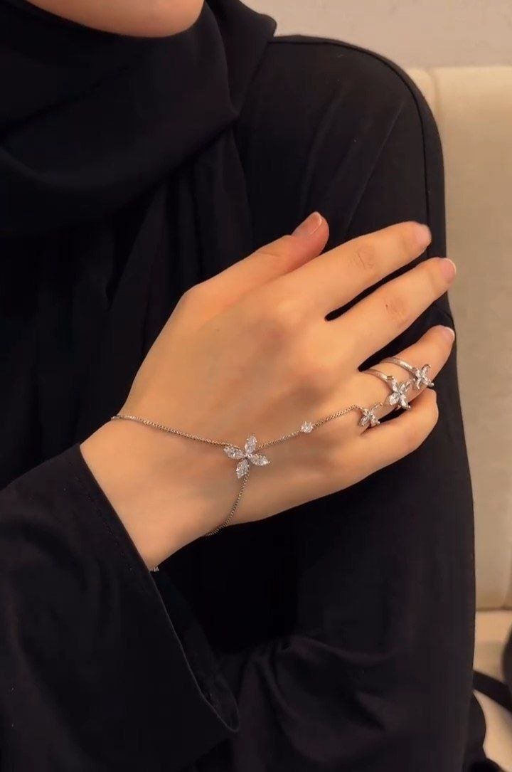 This sophisticated hand harness blends the elegance of a bracelet with the allure of a statement ring. Designed with a fine silver-toned chain, it features sparkling floral crystal motifs that rest beautifully across the hand, creating a graceful and contemporary silhouette. Lightweight and comfortable to wear, the piece adds a refined statement to evening ensembles, festive looks, or modern occasion wear. Perfect for those who appreciate distinctive jewelry with subtle glamour, this hand harness elevates any outfit with effortless sophistication.