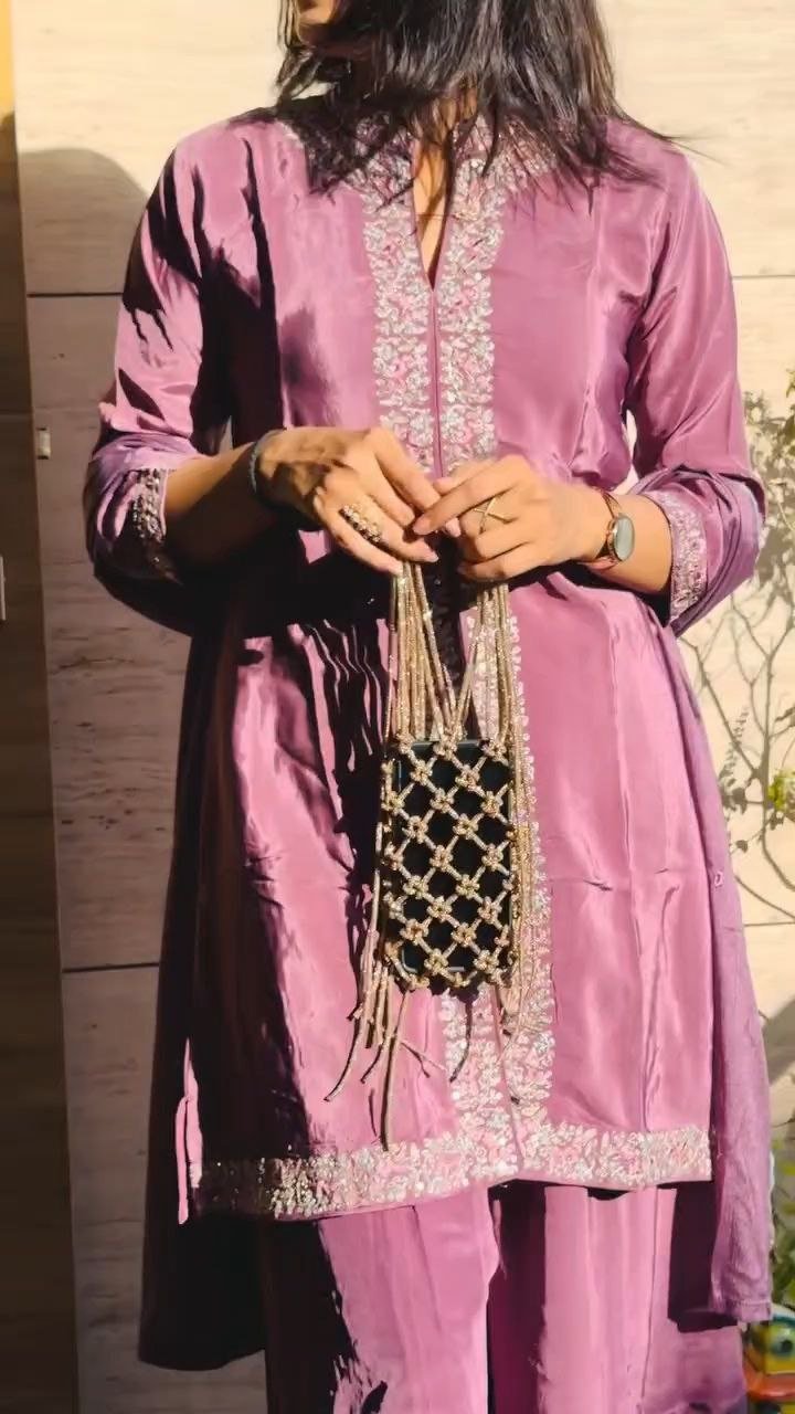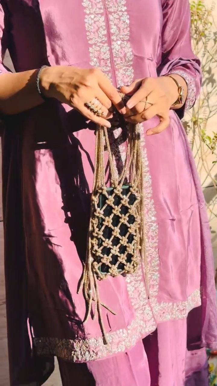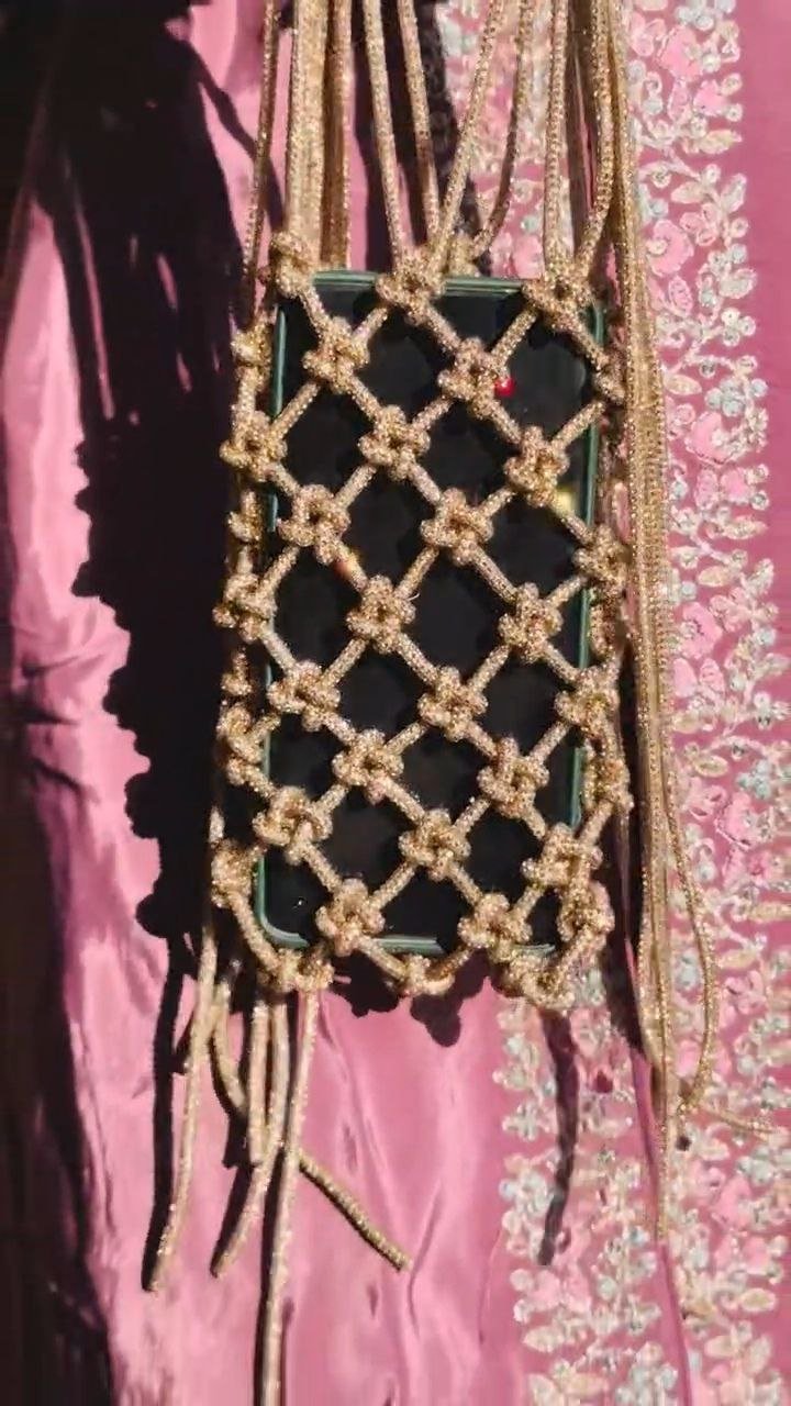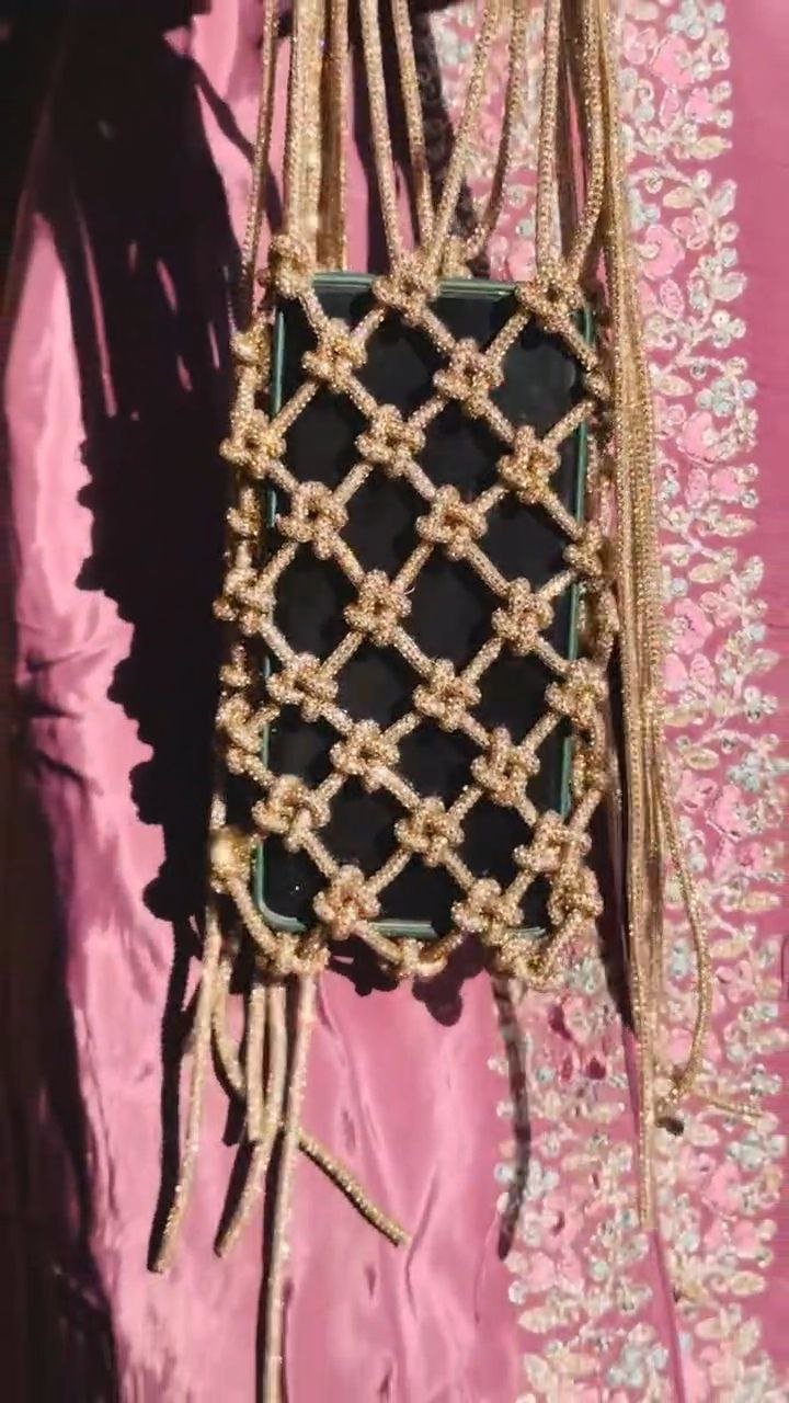 This gold beaded phone sling pouch features an intricate knotted net design that adds a statement touch to any outfit. Crafted to securely hold your smartphone, it combines style with convenience in a compact form. The lightweight construction and long sling strap make it comfortable for hands-free carrying, while the decorative detailing makes it perfect for festive events, parties, or special occasions. A stylish accessory that blends traditional charm with modern utility.