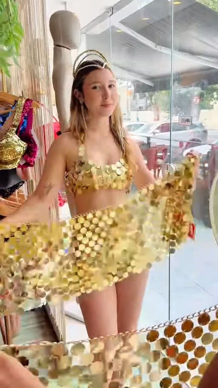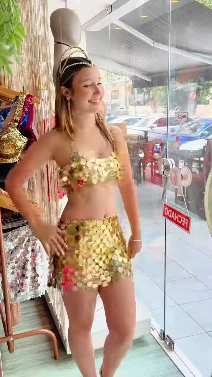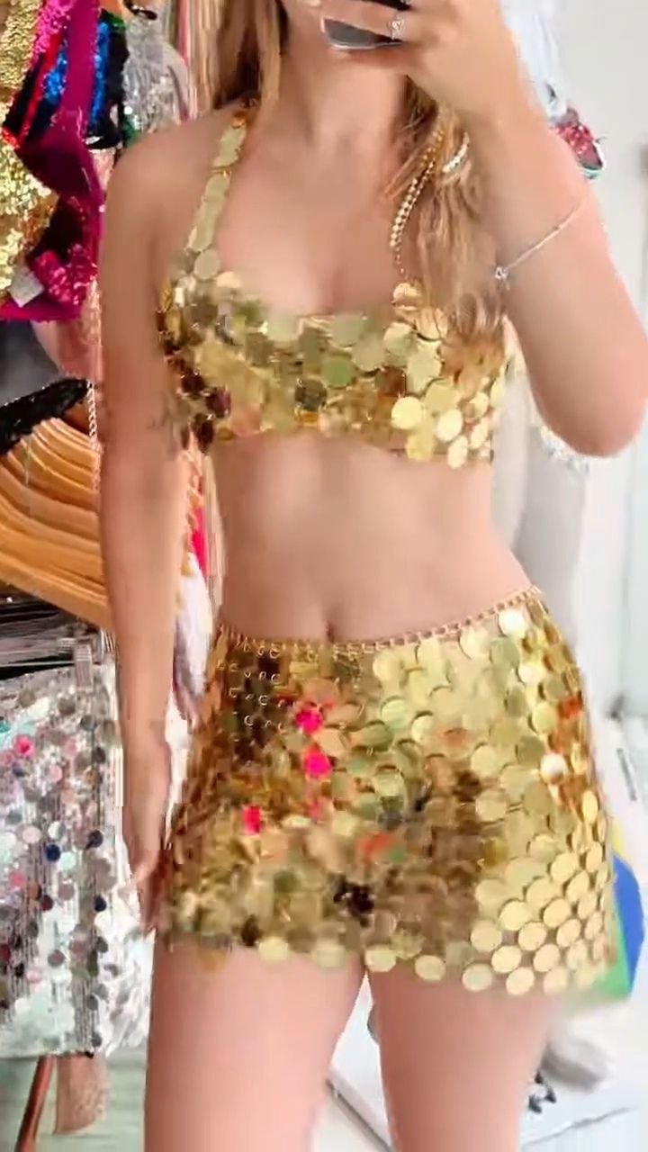 Eye-catching two-piece set featuring a halter-style crop top and matching mini skirt adorned with shimmering gold disc sequins. Designed to reflect light beautifully for standout party and festival looks.