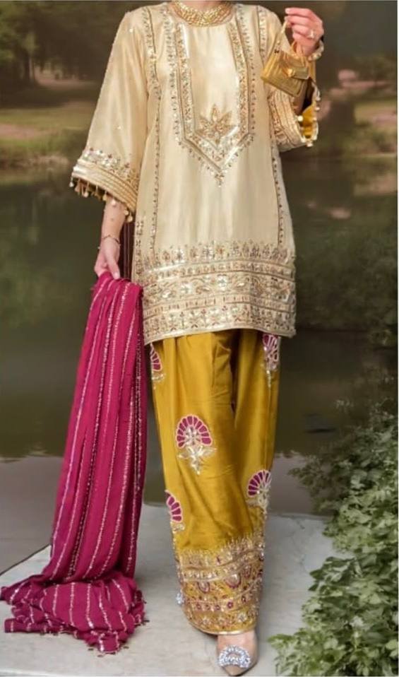 Complementing the kurta is a mustard yellow farshi-style wide-leg palazzo, which mirrors the top’s intricate silver embroidery along its flared hem for a balanced and regal appearance. The look is completed with a contrasting magenta striped dupatta, accented with subtle border details and tassels, providing a vibrant pop of color. This fully stitched set is designed for the wedding and festive season, offering both effortless movement and high-fashion elegance for the modern woman.