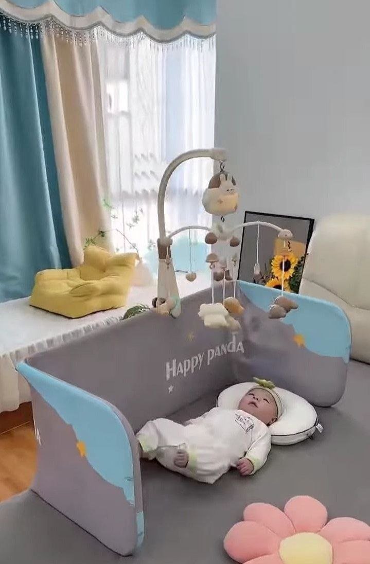 The Happy Panda Soft Baby Playpen is designed to create a cozy, secure space for babies to rest and play. Featuring padded side panels and a comfortable floor mat, it provides gentle support during tummy time, playtime, or quiet rest. The soft hanging mobile encourages visual engagement while keeping the environment calm and soothing. With its lightweight, foldable design and modern pastel look, this playpen fits easily into living rooms or nurseries, offering parents a practical and stylish solution for everyday baby care.