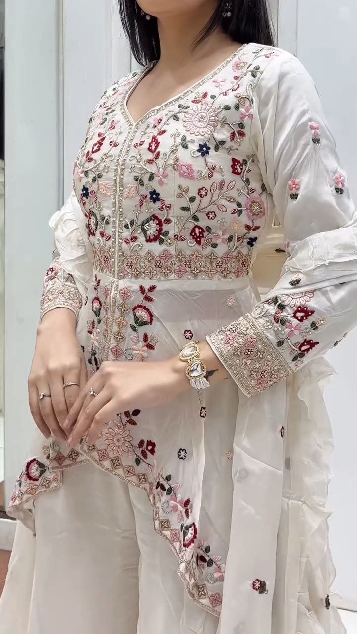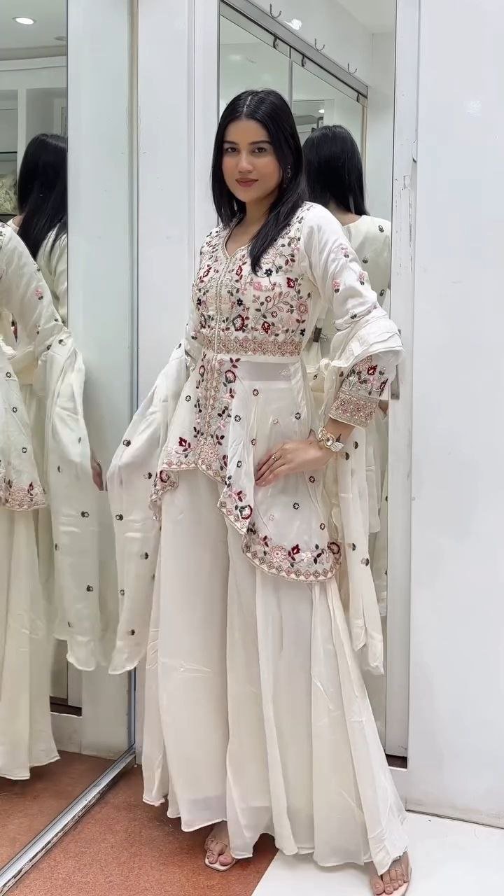 Embrace timeless elegance with this Ivory Embroidered Peplum Kurta with Sharara and Dupatta Set. The kurta features fine thread embroidery and mirror work that exudes sophistication, complemented by a flared georgette sharara that adds graceful movement. The lightweight organza dupatta with delicate border detailing enhances the ensemble’s refined charm.