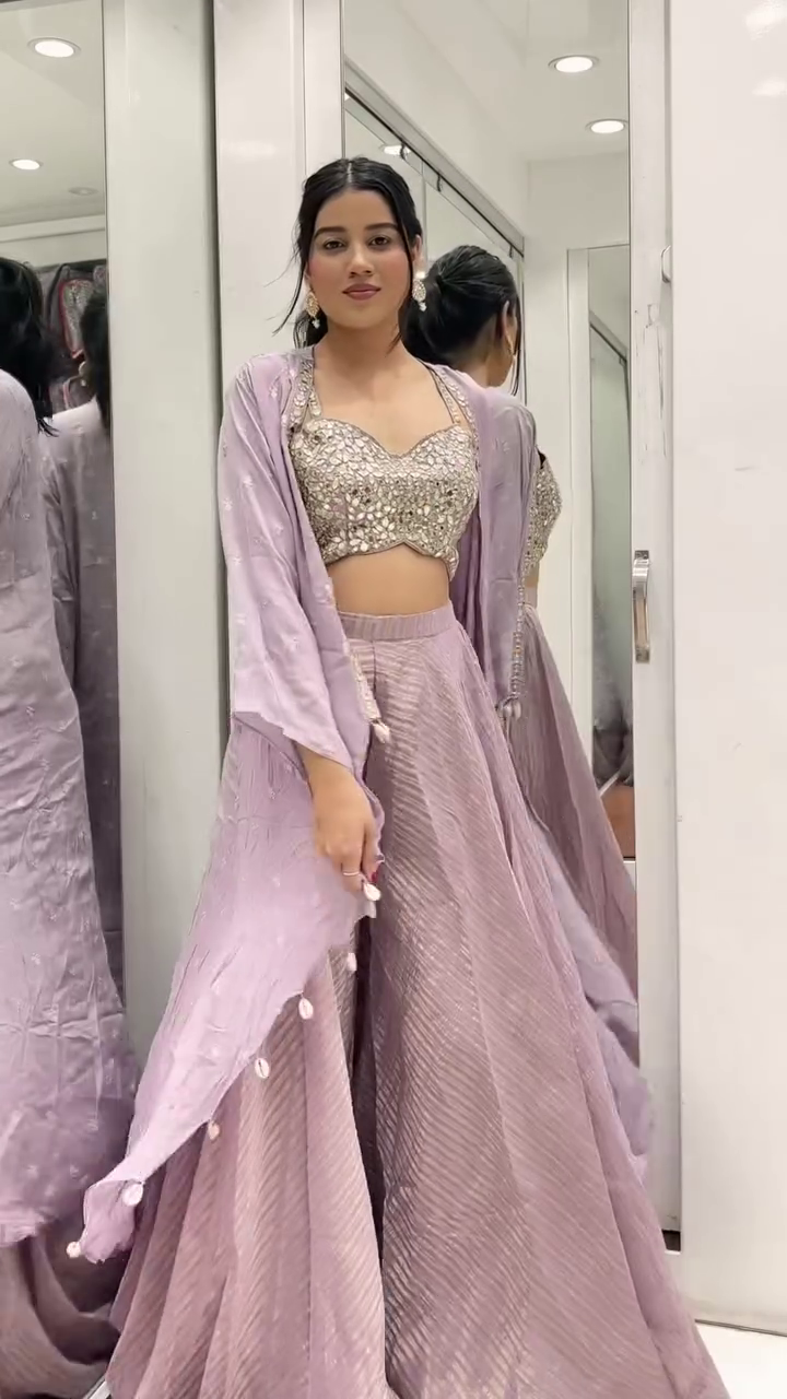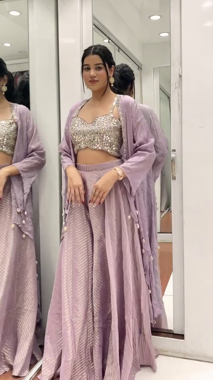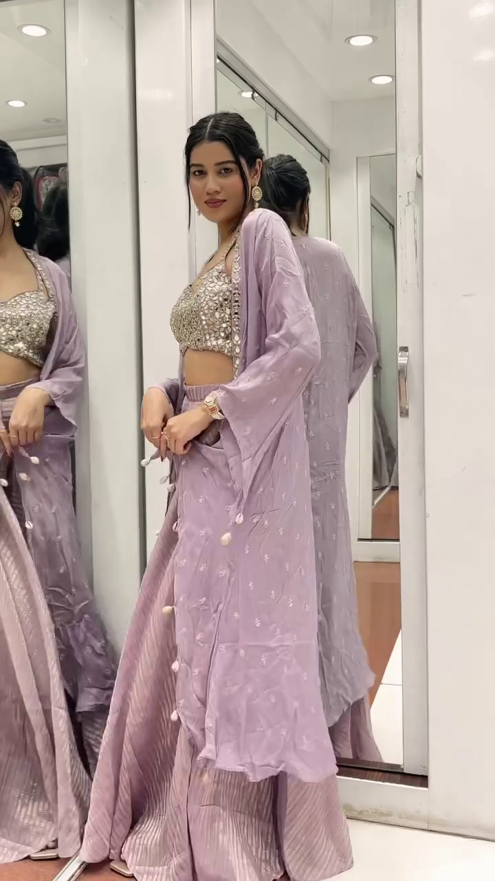 Bring glamour to your wardrobe with this stunning 3-piece lavender co-ord set, designed to make a statement at any occasion. The mirror-work embellished bustier blouse adds sparkle, while the flowy flared pants and the sheer tassel-detailed cape complete the regal look. Perfect for festive functions, sangeet, or mehendi celebrations.