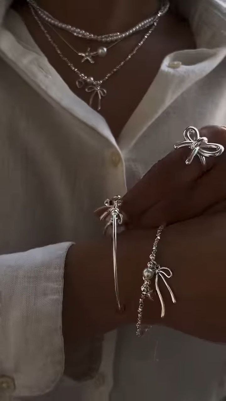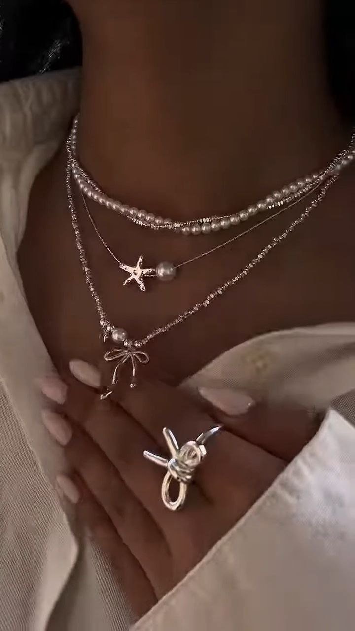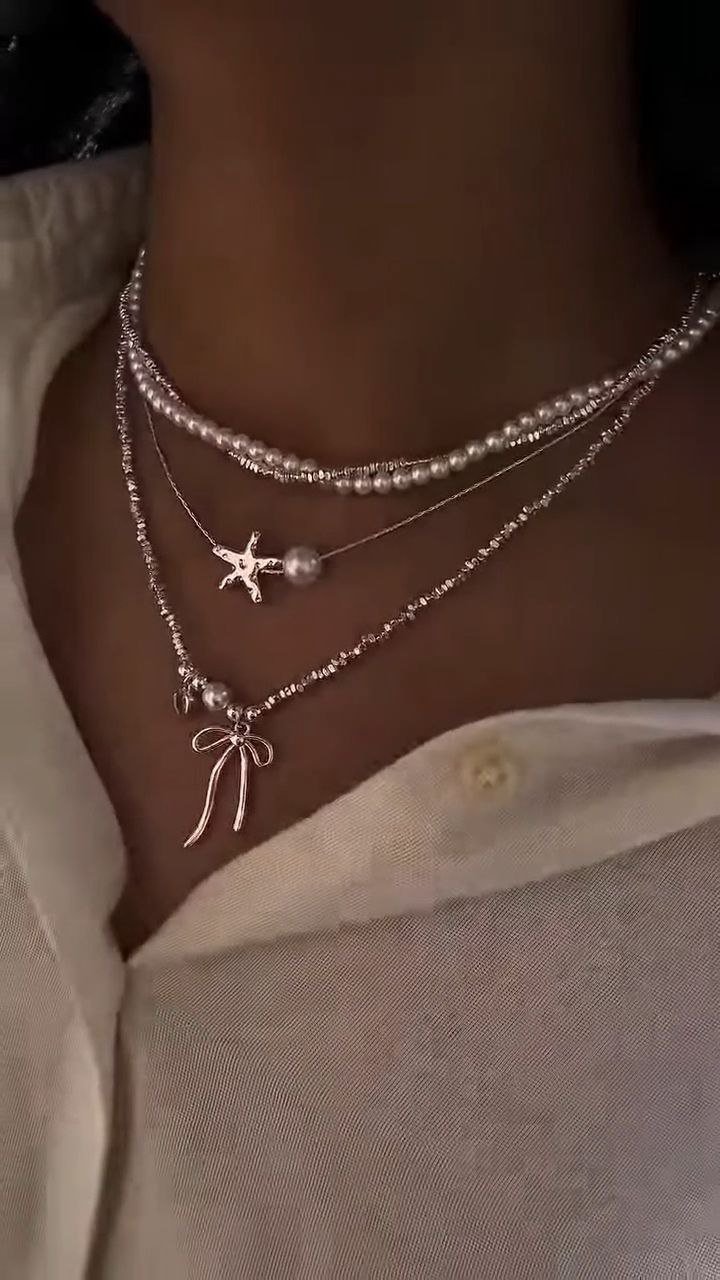 This layered necklace blends timeless elegance with modern charm. Designed with multiple fine chains, it features luminous pearl details, a minimalist star accent, and a graceful bow charm that adds a soft, romantic finish. The combination of textures and lengths creates a naturally layered look that sits beautifully along the neckline. Perfect for elevating everyday outfits or adding a subtle statement to evening wear, this necklace offers versatility, femininity, and understated sophistication.