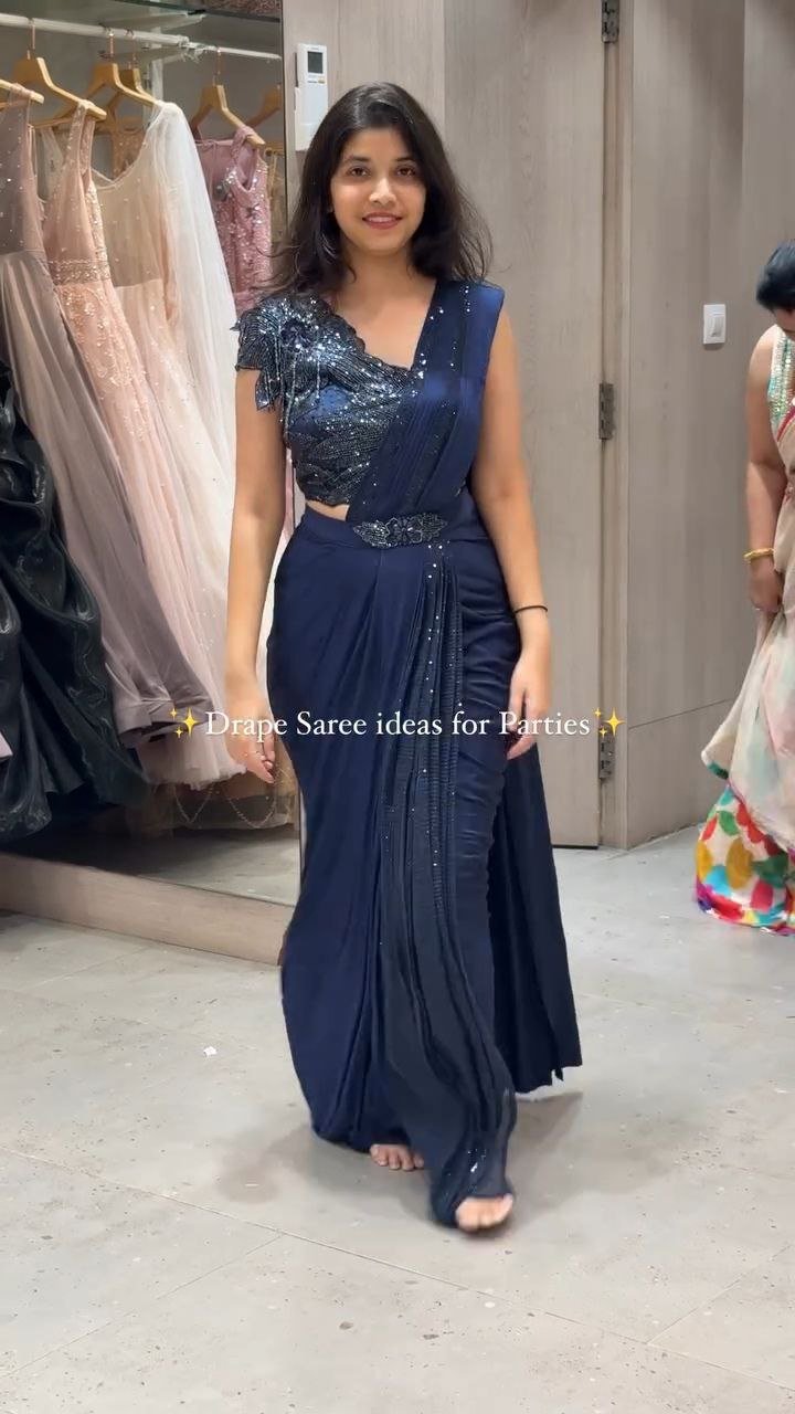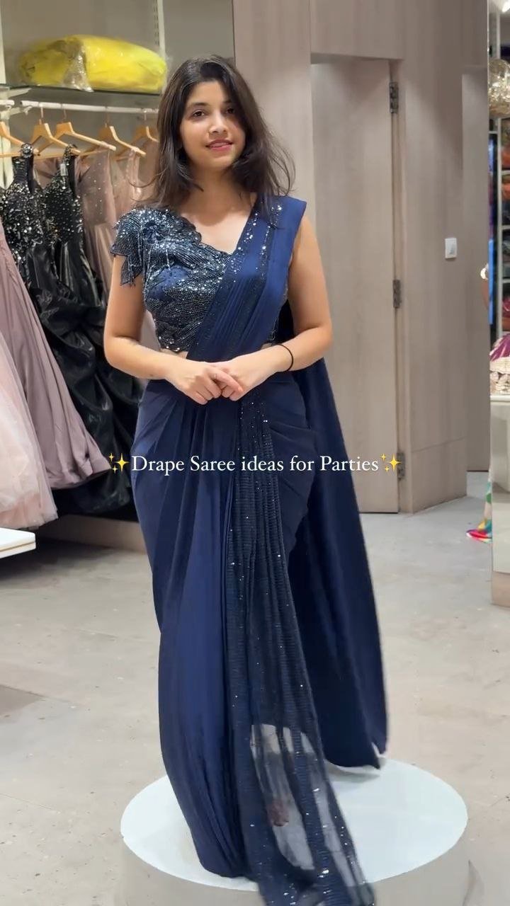 Shine effortlessly in this Midnight Blue Sequin Drape Saree, a perfect choice for parties and evening celebrations. Crafted from soft georgette, this saree flows elegantly while the all-over sequin embellishments add a glamorous shimmer. The matching designer blouse features heavy sequin detailing and a modern cut, enhancing its contemporary appeal.