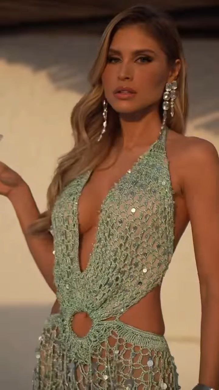 This mint sequin net evening gown is designed to make a striking impression. Crafted from delicate net fabric and adorned with all-over shimmering sequins, the gown features a deep plunging neckline paired with a bold circular waist cut-out that accentuates the silhouette. The halter-style bodice flows into a floor-length sheer skirt, creating an elegant balance of glamour and allure. Perfect for resort evenings, cocktail parties, or luxury events, this gown offers a confident, statement-making look with refined sparkle.