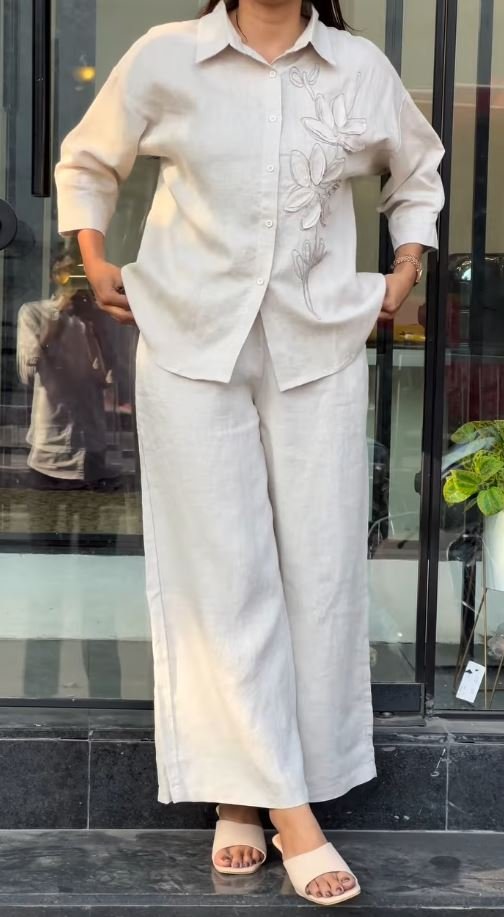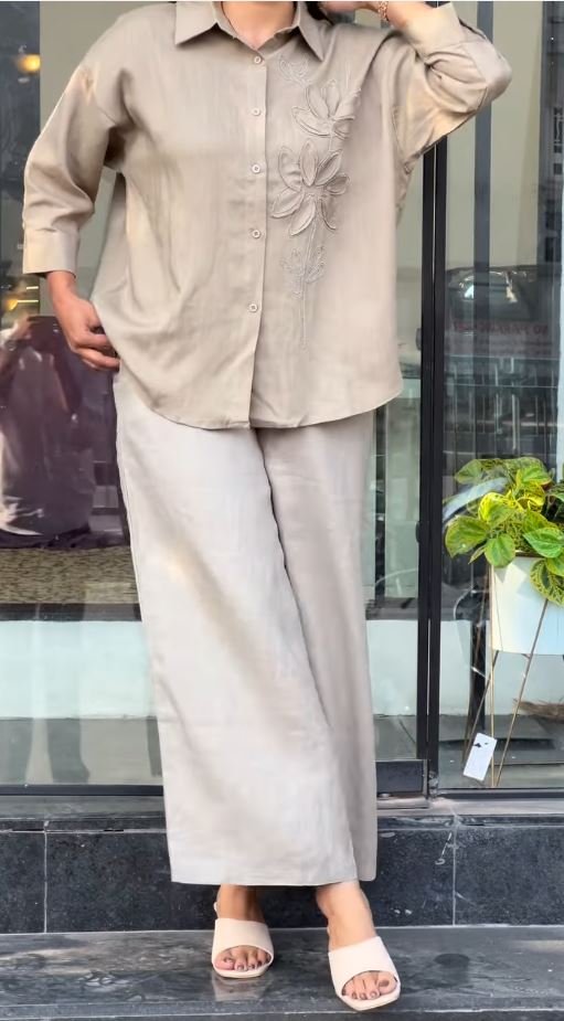 Experience the perfect blend of minimalist elegance and artisanal detail with this Modern Beige Co-Ord Set.
