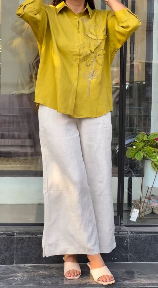 Bottoms: Coordinating wide-leg trousers designed for a fluid, comfortable drape.