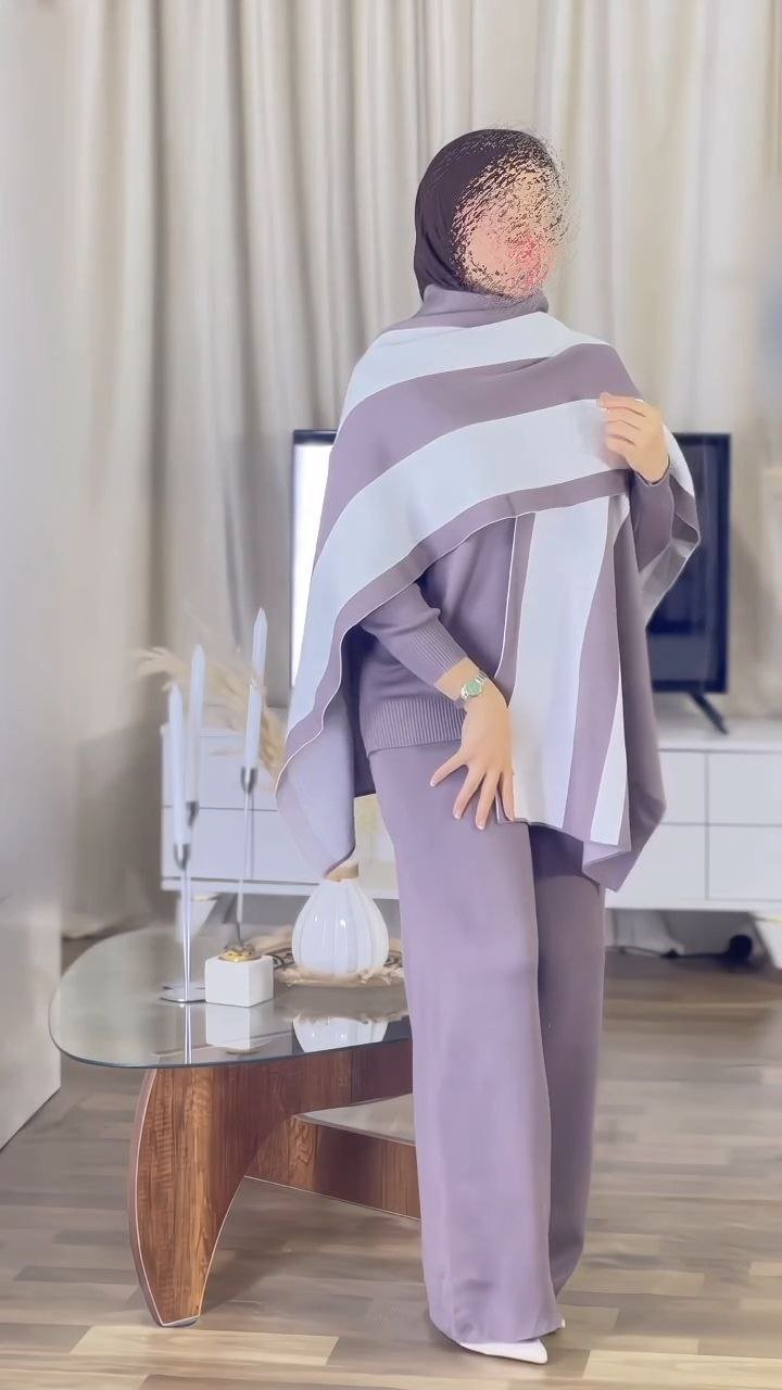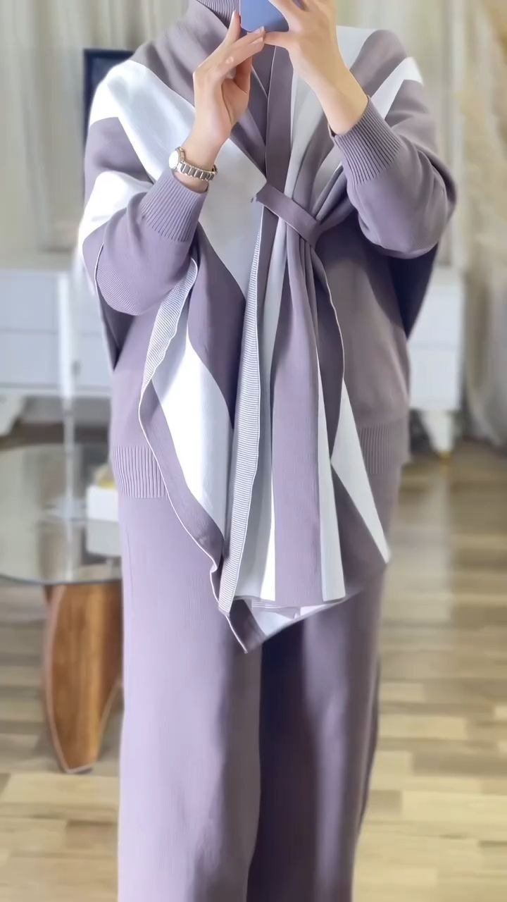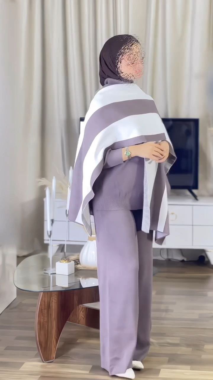 Elegant two-piece modest co-ord set featuring a relaxed-fit knit top and wide-leg pants, paired with a detachable contrast shawl overlay. Designed for comfort with a refined, contemporary silhouette.