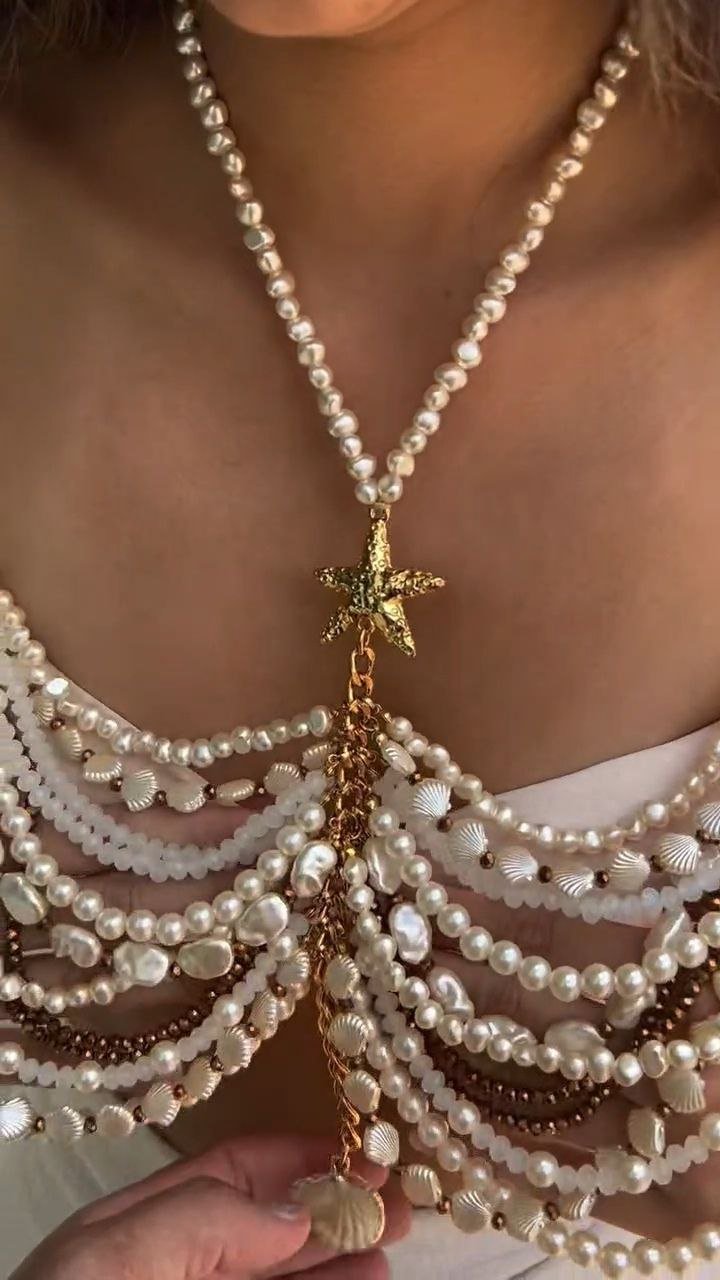 Elevate your resort wardrobe with the Ocean Pearl Drape Statement Top, a handcrafted piece inspired by coastal elegance. Featuring cascading layers of luminous pearls, natural shells, and delicate gold-tone chains, this top creates a sculpted, jewelry-inspired silhouette that drapes beautifully across the bodice.