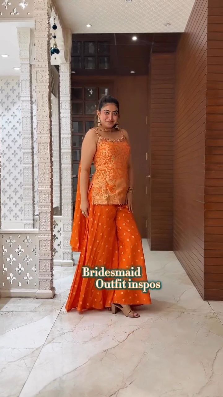 This elegant orange sharara set is crafted for festive moments that demand comfort with statement style. The sleeveless short kurti features detailed embroidery that enhances the neckline and bodice, creating a rich ethnic appeal. Paired with wide-leg sharara pants adorned with classic polka patterns, the silhouette flows gracefully with every movement. Ideal for weddings and celebratory occasions, this outfit blends traditional craftsmanship with a contemporary fit, making it a versatile addition to your ethnic wardrobe.