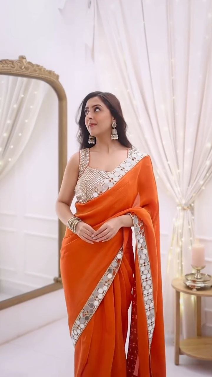 Orange Mirror Work Designer Saree with Embellished Blouse