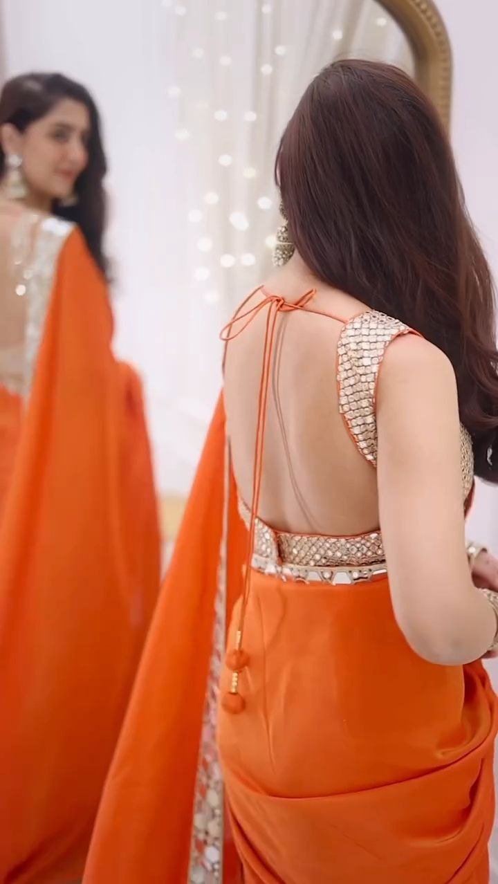 A graceful orange saree featuring a striking mirror-work border, paired with a heavily embellished sleeveless blouse for a refined festive look.