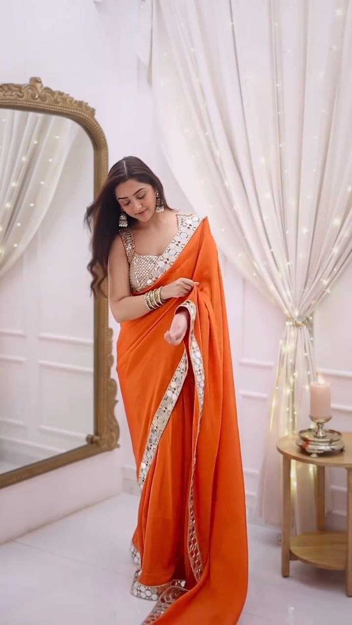 This elegant orange saree is designed to make a statement with its shimmering mirror-work border that adds a festive charm. Crafted in a lightweight fabric, it drapes effortlessly and enhances the silhouette. The sleeveless blouse features detailed mirror and embroidery work, perfectly complementing the saree’s vibrant tone. Ideal for weddings and special occasions, this saree blends traditional craftsmanship with contemporary elegance, making it a timeless addition to your ethnic wardrobe.
