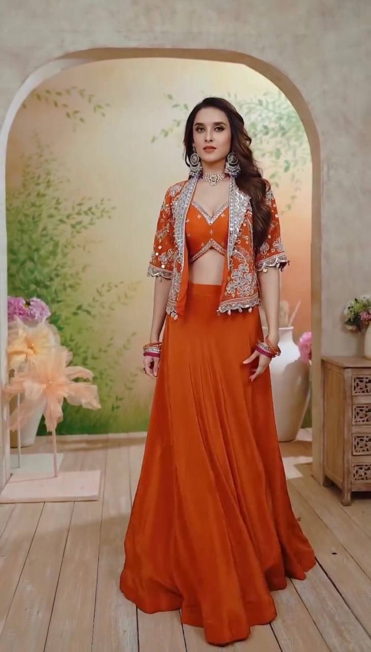 Step into the spotlight with this Stunning Orange Rangoli Silk Lehenga Choli, a masterpiece of modern ethnic fashion. The set centers on a beautifully flared skirt made from premium Rangoli silk, providing a sleek and elegant silhouette. It is paired with a coordinated crop-top blouse that features intricate front embroidery to match the overall aesthetic.