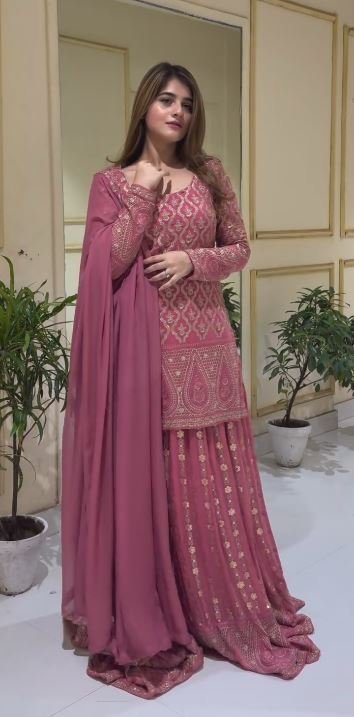 - Sequins Work: Intricate sequins detailing across the bodice and neckline, adding a touch of glamour and sparkle to the outfit. Ideal for evening parties or celebrations.
