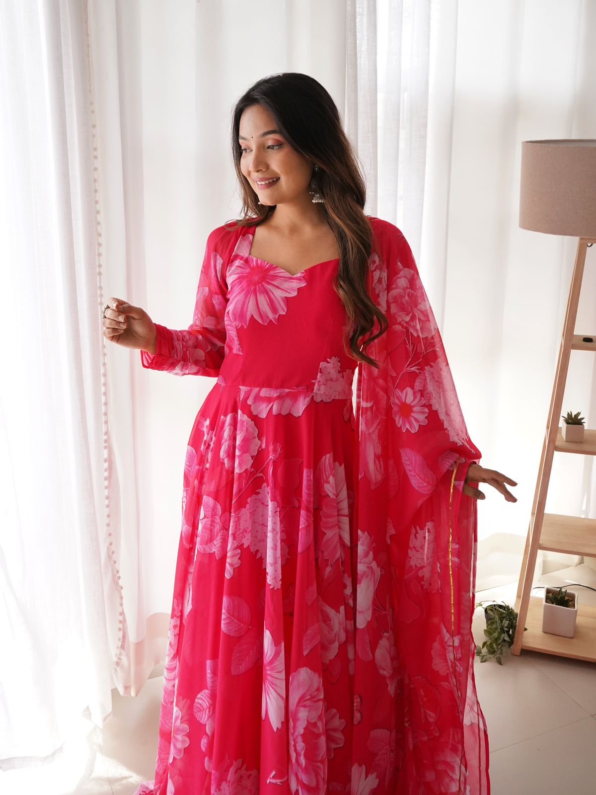👚Gown Fabric:Heavy Heavy Faux Georgette With Beautiful Digital Print Work With Attached Pad With Full Sleeve and Latkan Dori With Fully 8 Meter Flair