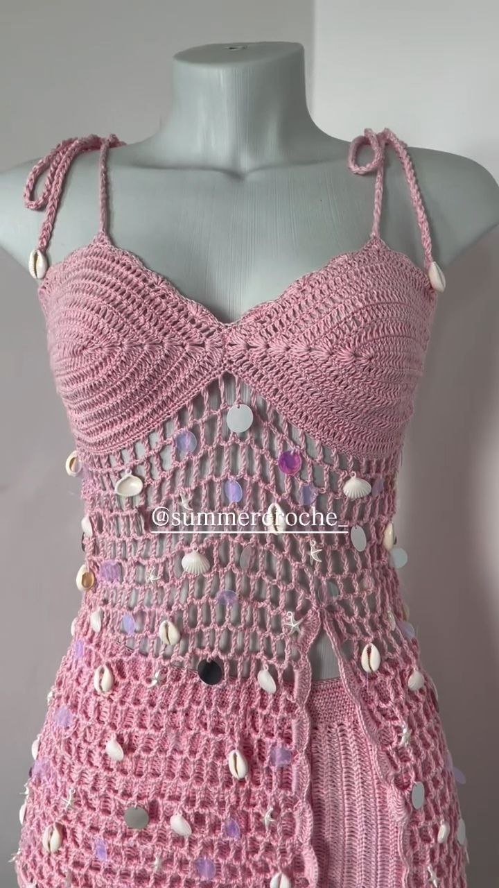 This pink crochet mini dress features a beautifully handcrafted design that blends delicate detailing with a flattering silhouette. The structured crochet bust with a sweetheart neckline provides shape and support, while adjustable shoulder tie straps ensure a comfortable and customizable fit.