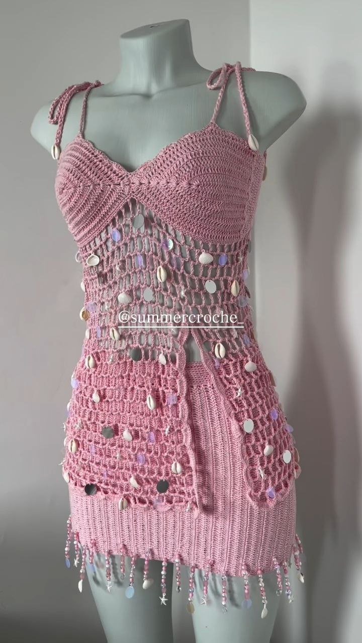 The open-knit midsection is enhanced with shell and subtle sequin embellishments, adding texture and visual interest. A softly fitted crochet skirt completes the look, finished with beaded fringe accents along the hem for gentle movement. Ideal for beach vacations, resort evenings, or summer parties, this dress pairs effortlessly with sandals or statement accessories for an elegant, standout look.
