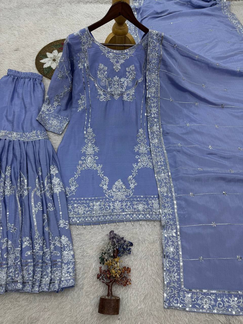 Be the first to review “Powder Blue Chinon Sharara Suit with Sequence Work”