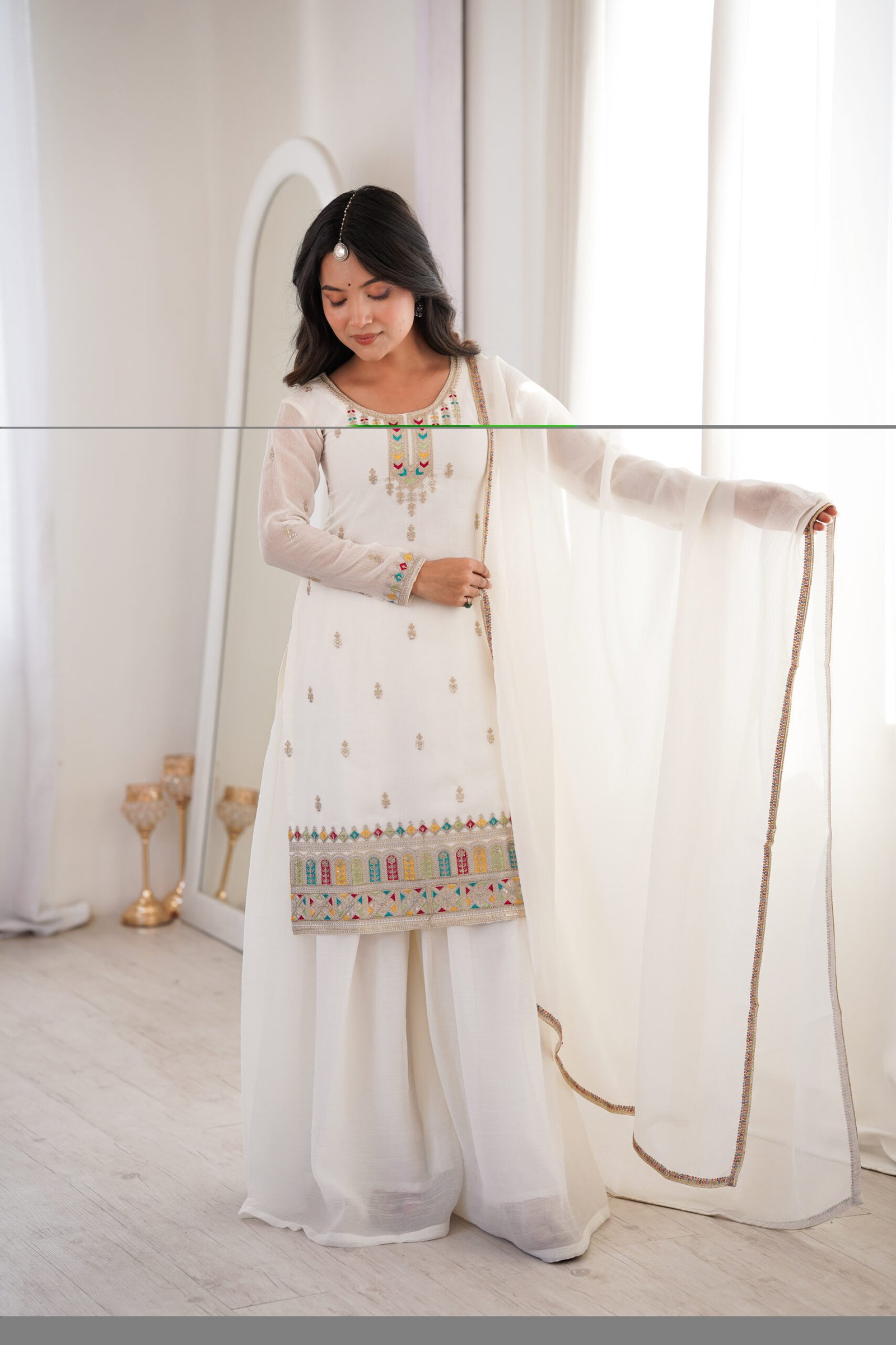 Step into timeless elegance with this stunning Pure White Sharara Suit Set. Crafted from premium heavy soft crunchy silk, this ensemble is designed to offer a regal and sophisticated silhouette for any celebratory occasion.