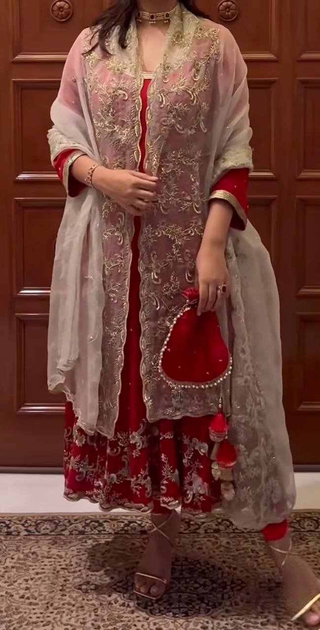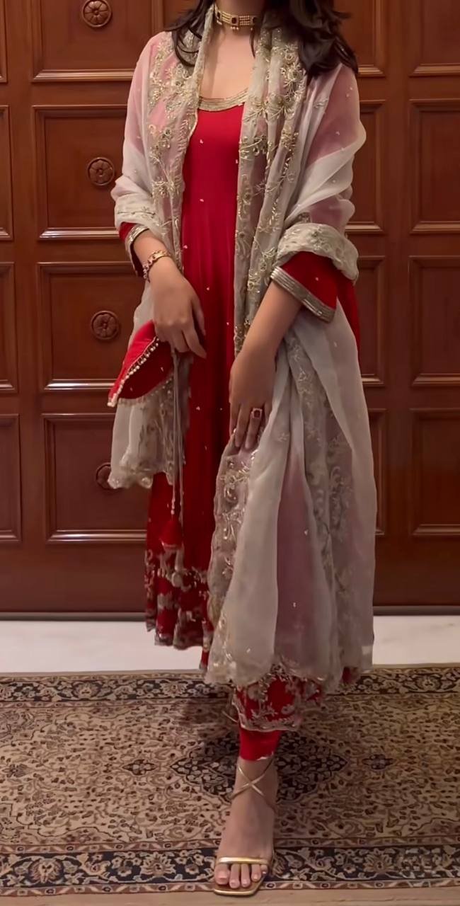 An elegant red Anarkali suit adorned with delicate embroidery and subtle embellishments, paired with a sheer embroidered organza dupatta. Designed for festive occasions and celebrations.