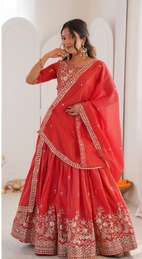 Complementing the ensemble is a matching dupatta adorned with fine embroidery and a decorative border that enhances the overall elegance of the outfit. The vibrant red color combined with detailed craftsmanship makes this lehenga an ideal choice for weddings, engagement ceremonies, festive celebrations, and traditional events. Designed to offer both comfort and style, this ensemble creates a regal and sophisticated look for any special occasion.