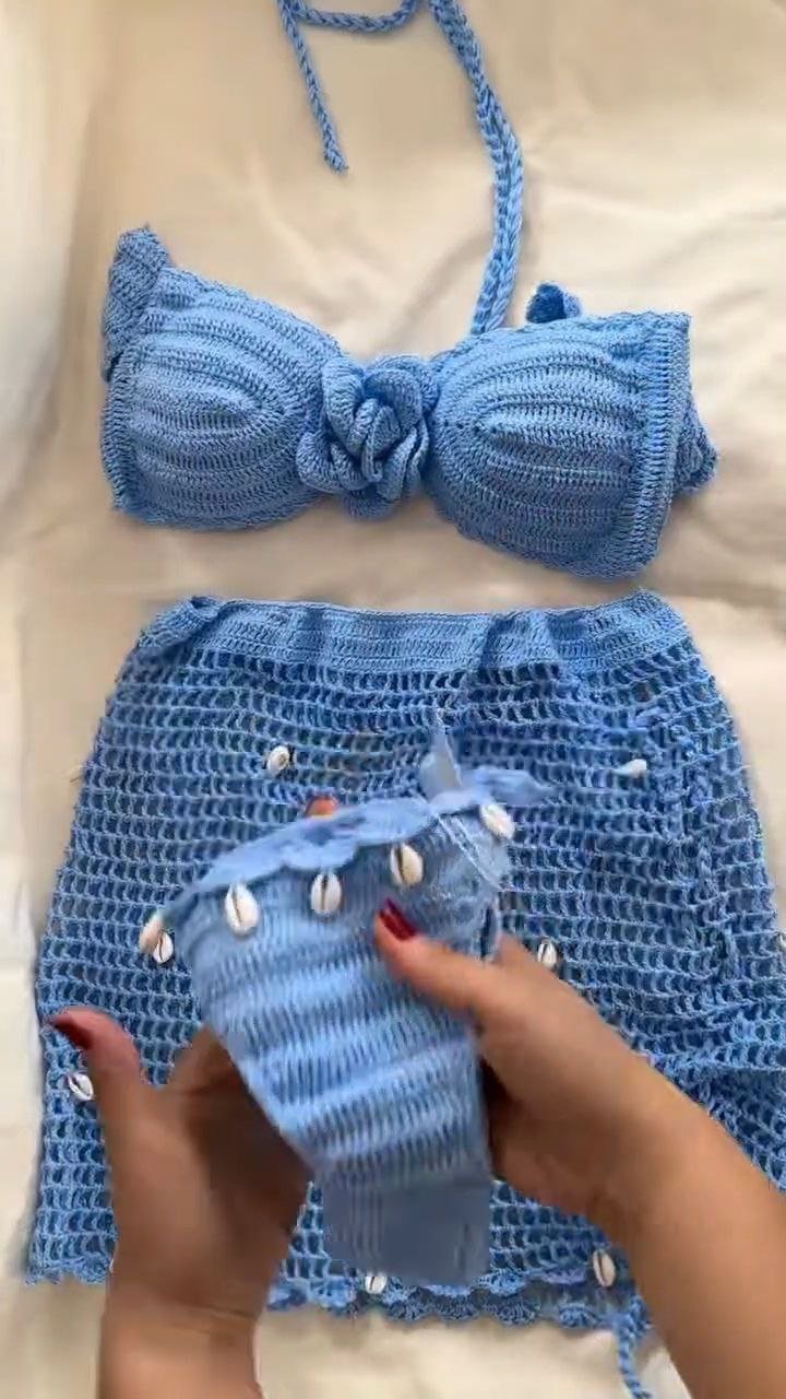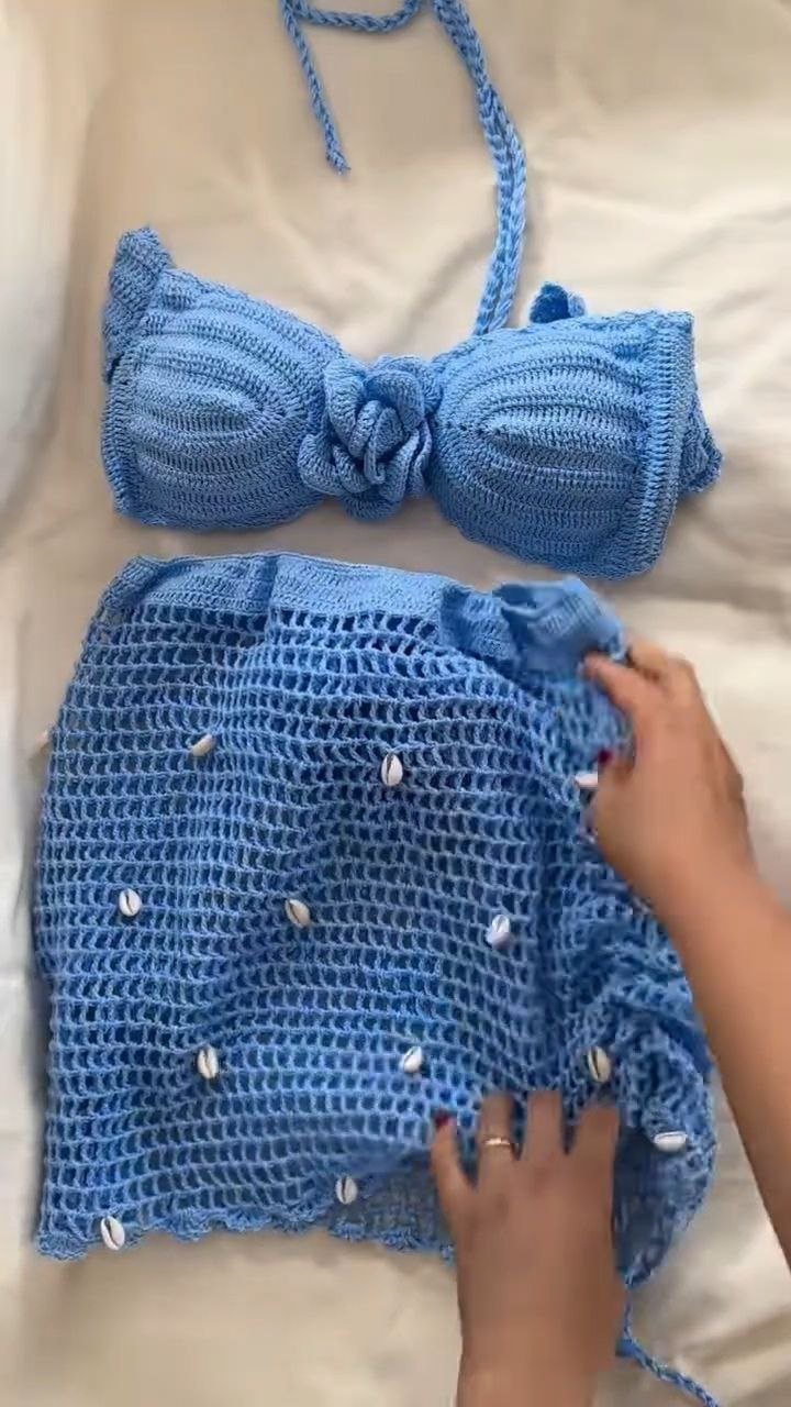 Three-piece handcrafted crochet swim set featuring a knotted bandeau top, matching bikini bottoms with shell accents, and a coordinating open-knit mini skirt. Perfect for beach holidays and summer styling.