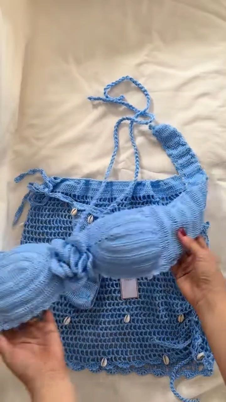 Make a statement this season with this beautifully crafted sky blue crochet bikini set. Designed with a textured knit finish, the bandeau-style top features a central knot detail and braided halter ties for a secure and flattering fit. The soft stretch crochet fabric enhances comfort while maintaining a stylish, sculpted look.