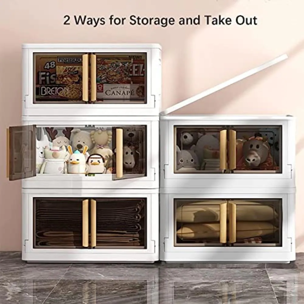 Space-saving stackable storage box with clear front doors for easy visibility and access. Designed for organizing clothes, toys, snacks, or household items, with two convenient opening styles for quick storage and retrieval.