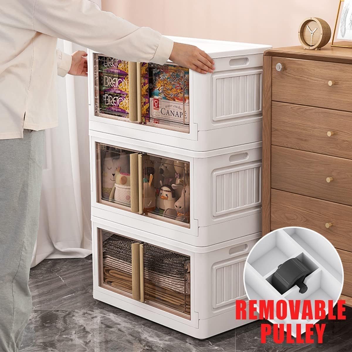 Each box features a transparent front door that allows you to easily see what’s inside without opening the container. The double-door design with sturdy handles ensures smooth opening and closing while keeping your items protected from dust.