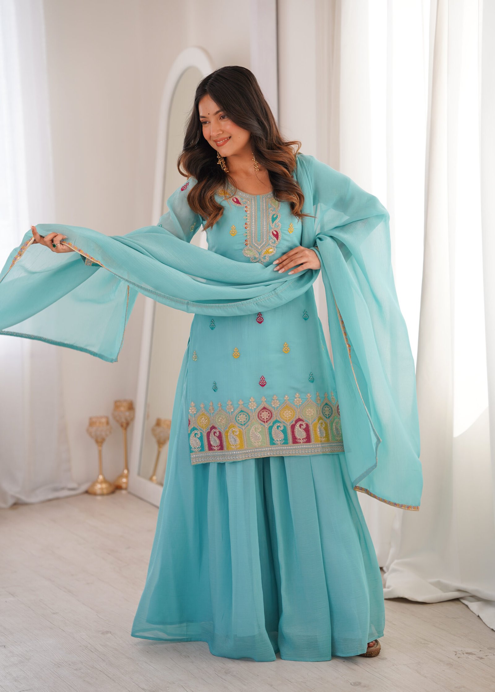 Elegant turquoise three-piece suit featuring a delicately embroidered straight kurta, flowy palazzo pants, and a lightweight matching dupatta with subtle border detailing. Perfect for festive gatherings, daytime celebrations, and traditional occasions.