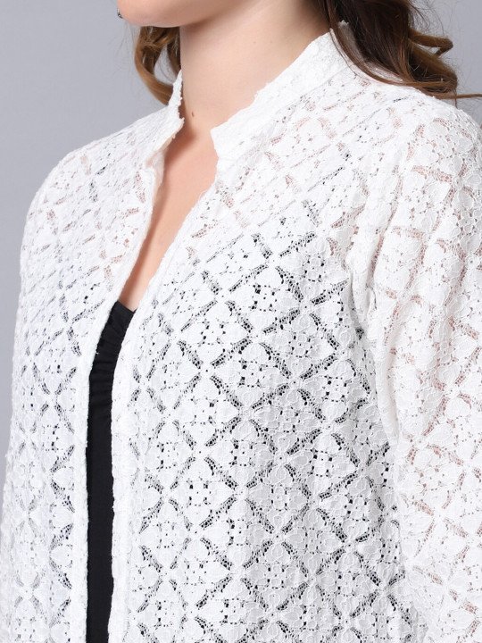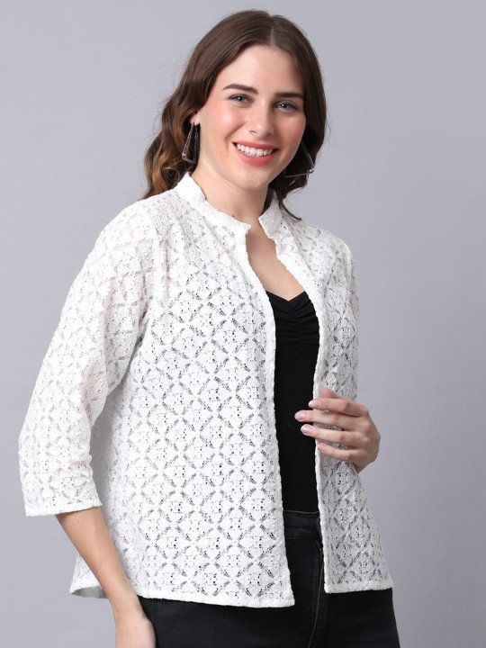 Expertly crafted from soft, high-quality pure cotton, this shrug features an intricate self-design pattern that mimics fine lace,