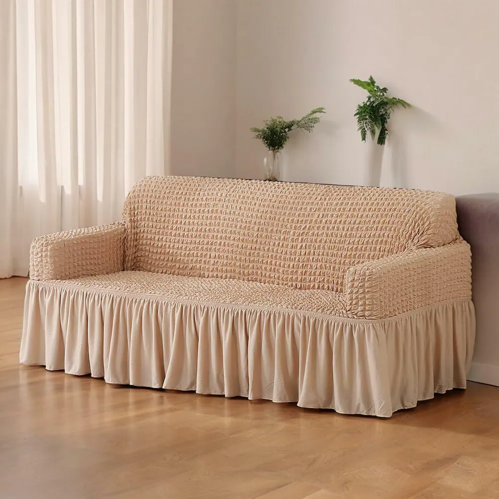 Soft, stretchable waffle-textured sofa cover designed to protect and refresh your furniture. The elegant skirted design adds a decorative touch while providing full coverage for a clean and cozy look.