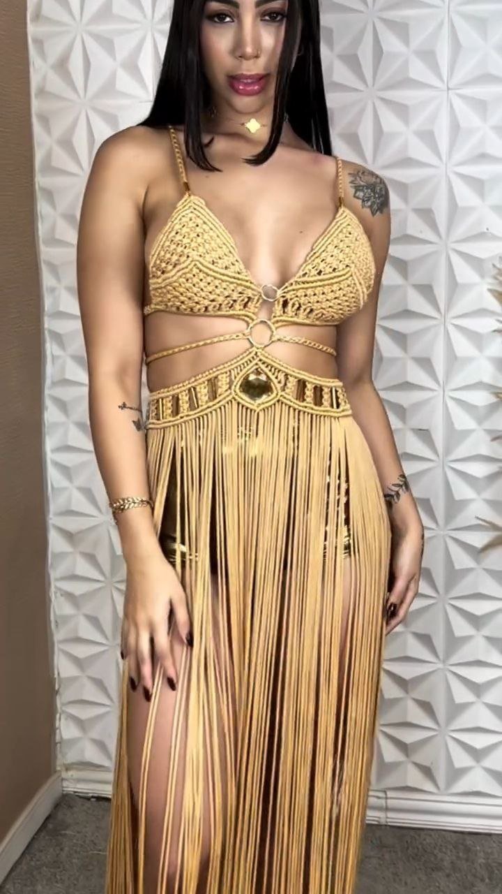 Statement beachwear set featuring a crochet halter bikini top with gold ring accents, matching bottoms, and a dramatic high-waisted fringe skirt overlay. Designed for standout resort and poolside styling.