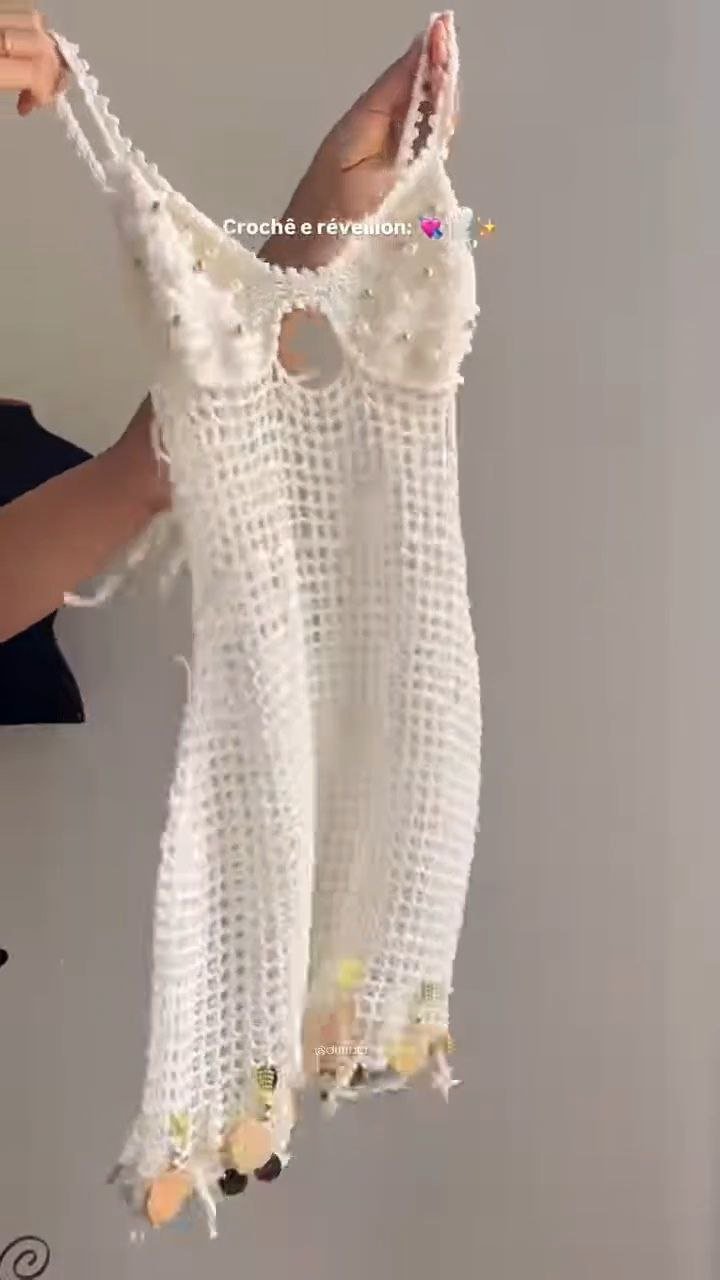 This white crochet mini dress showcases a delicate handcrafted design with a lightweight open-knit texture. The sleeveless silhouette features a subtle front cut-out detail that adds a modern touch while maintaining an elegant look. Designed to offer a flattering slim fit, the dress drapes comfortably and enhances natural movement.
