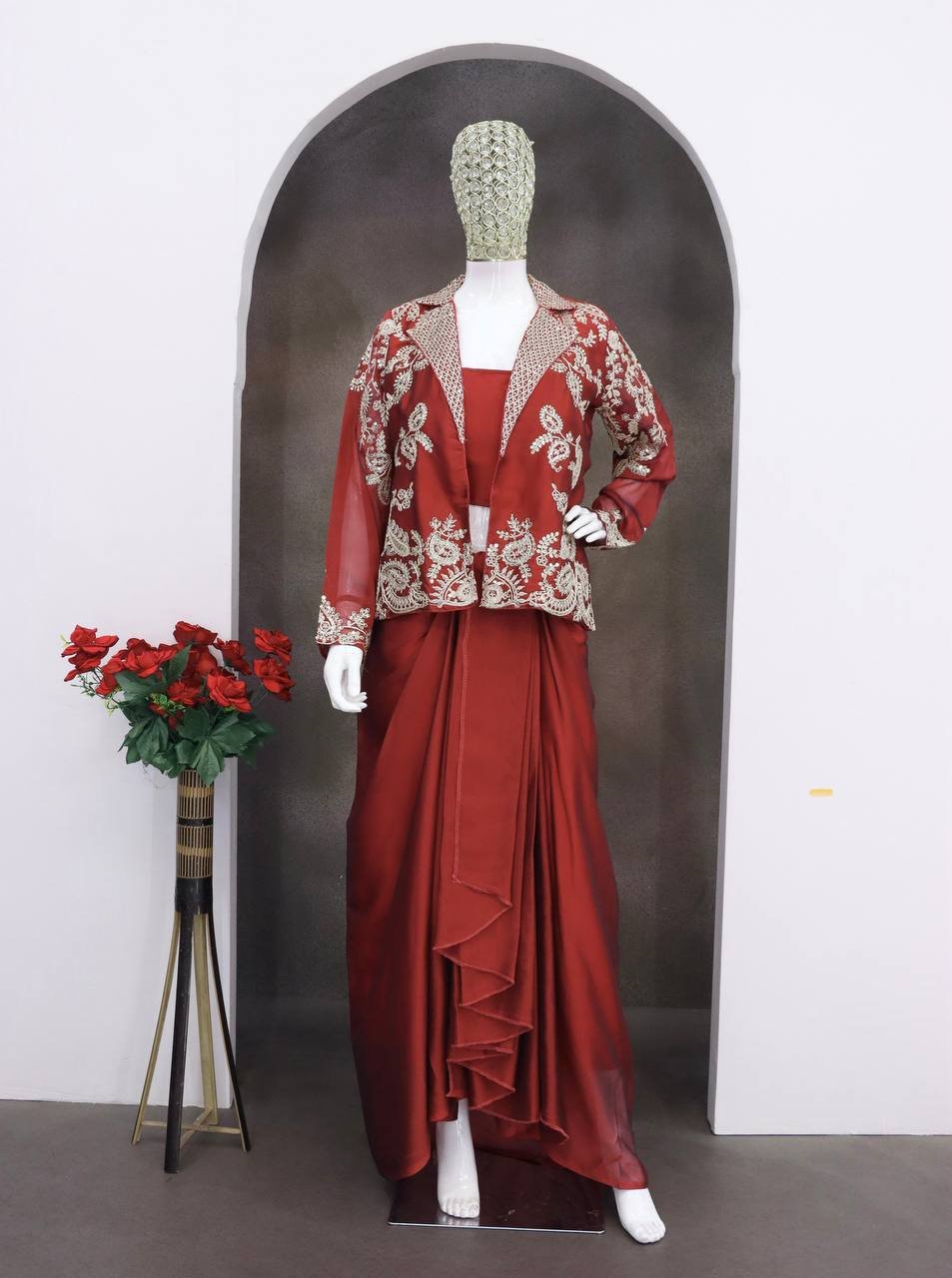 A sophisticated wine red ensemble featuring a flowy draped skirt, a sleek blouse, and a heavily embroidered jacket—perfect for festive and contemporary occasions.