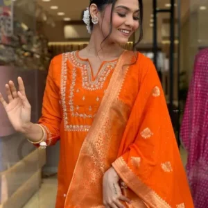 Women’s Orange Chanderi Viscose Embroidered Straight Kurta with Chanderi Viscose Pant and Jacquard Jacquard Dupatta Sets